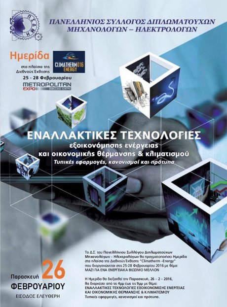 Τυπικές εφαρμογές, κανονισμοί και πρότυπα Το Δ.Σ. Του Πανελληνίου Συλλόγου Διπλωματούχων Μηχανολόγων – Ηλεκτρολόγων θα πραγματοποιήσει Ημερίδα στα πλαίσια της...